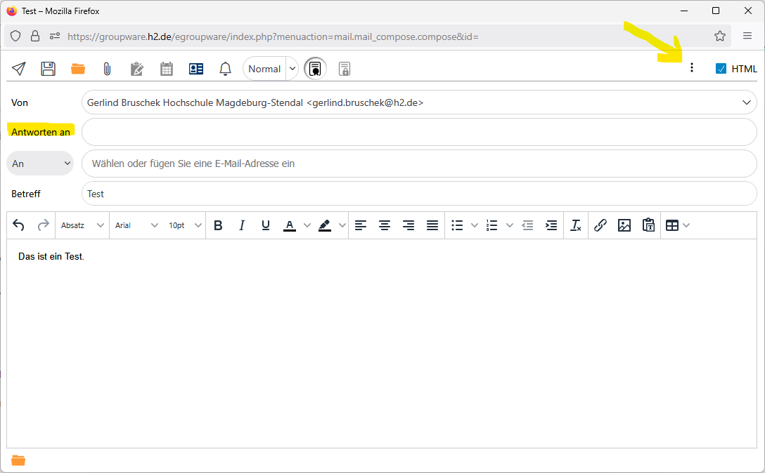 2. Zum Erstellen der Mail in EGroupware ein Verfassen-Fenster öffnen, den Mail-Text sowie den Betreff eingeben und bei Bedarf eine Rückantwortadresse bei "Antworten an" angeben.