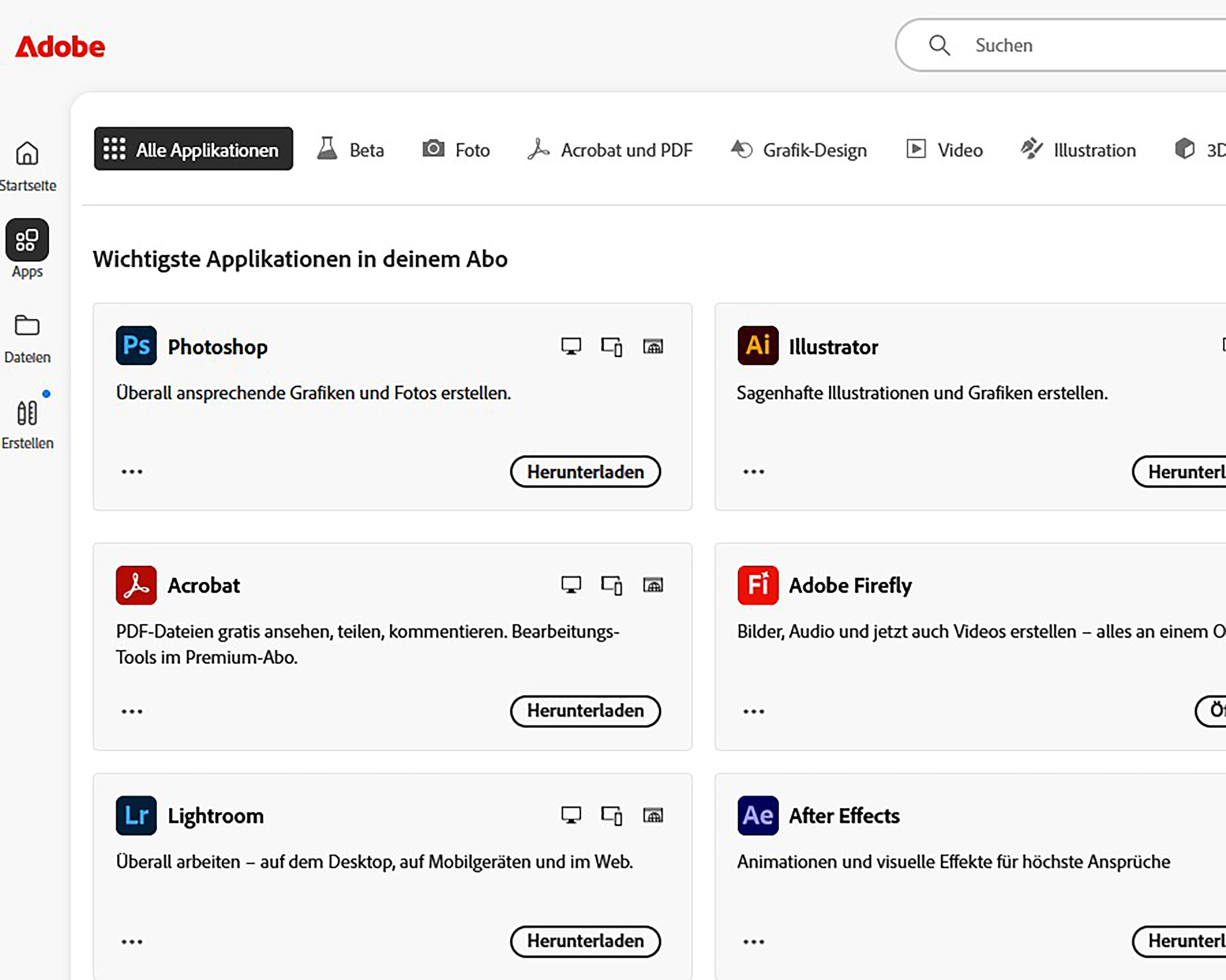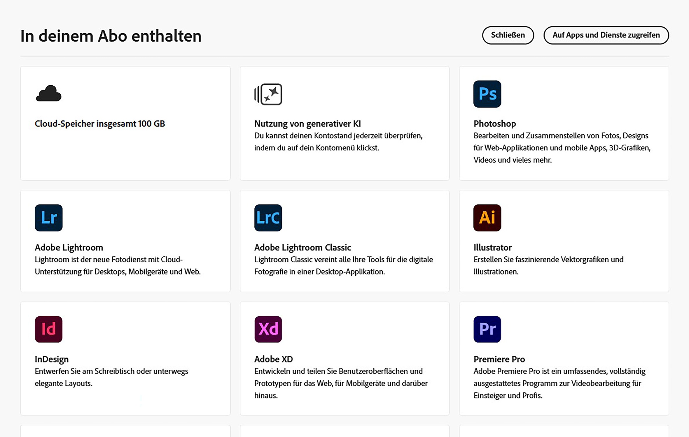 Sie sind bei Adobe angemeldet und können im Abo-Bereich Auf Apps und Dienste zugreifen.