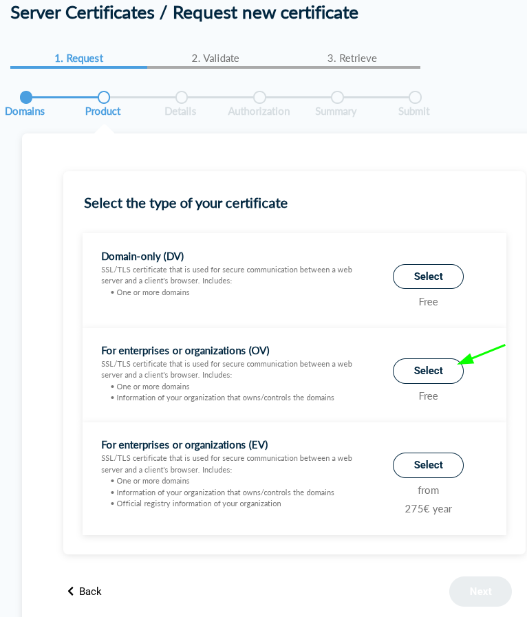 - Wählen Sie "For enterprises or organizations (OV)" und bestätigen Sie mit "Next"