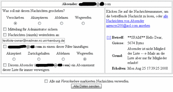 Sie haben hier die gleichen Auswahlmöglichkeiten wie beim Abonnementsantrag: Annehmen, Ablehnen oder Wegwerfen. Ebenso haben Sie hier die Möglichkeit, "diesem Absender (xxxxxxx2xx@yxz.com) ein Abonnement dieser Liste für immer (zu) verweigern" (unterste Checkbox).